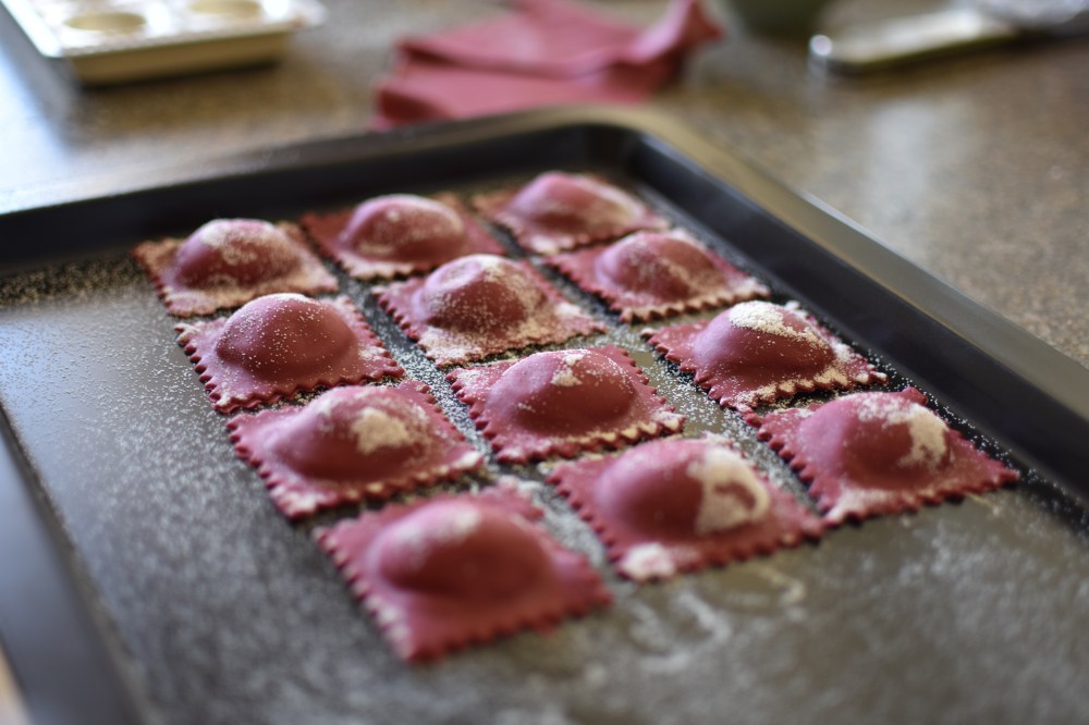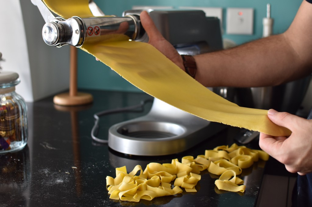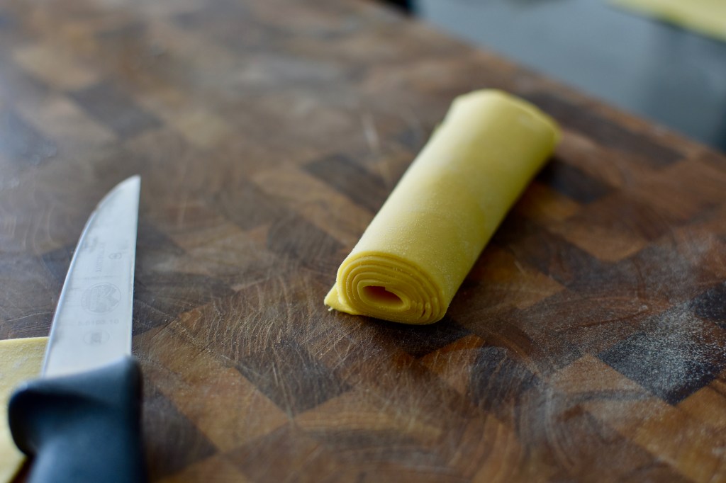 When it comes to rolling out your dough, the easiest way is to use a pasta machine. However, if you don’t happen to have one lying around, get out the good old rolling pin, and roll it out to a thickness of about 1-2mm. Be sure to use a generous dusting of semolina or flour to prevent your pasta from sticking.
