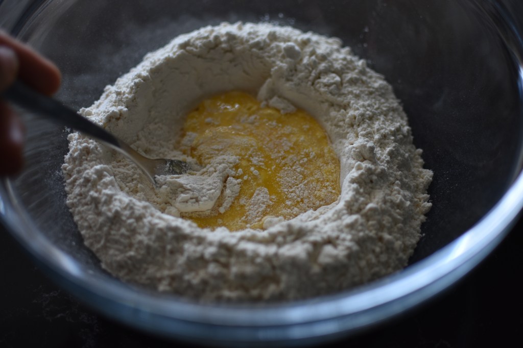 - Beat the eggs together with a fork, then slowly combine with the flour by gradually bringing in flour into the centre to form a dough.