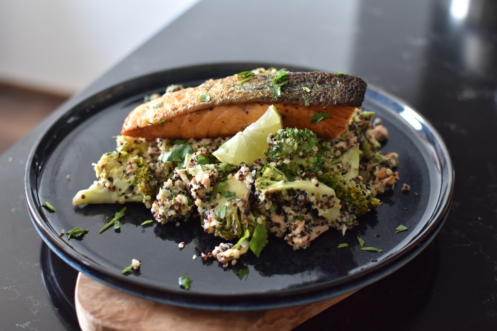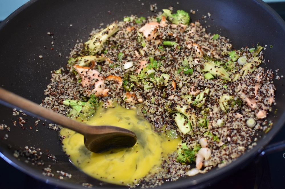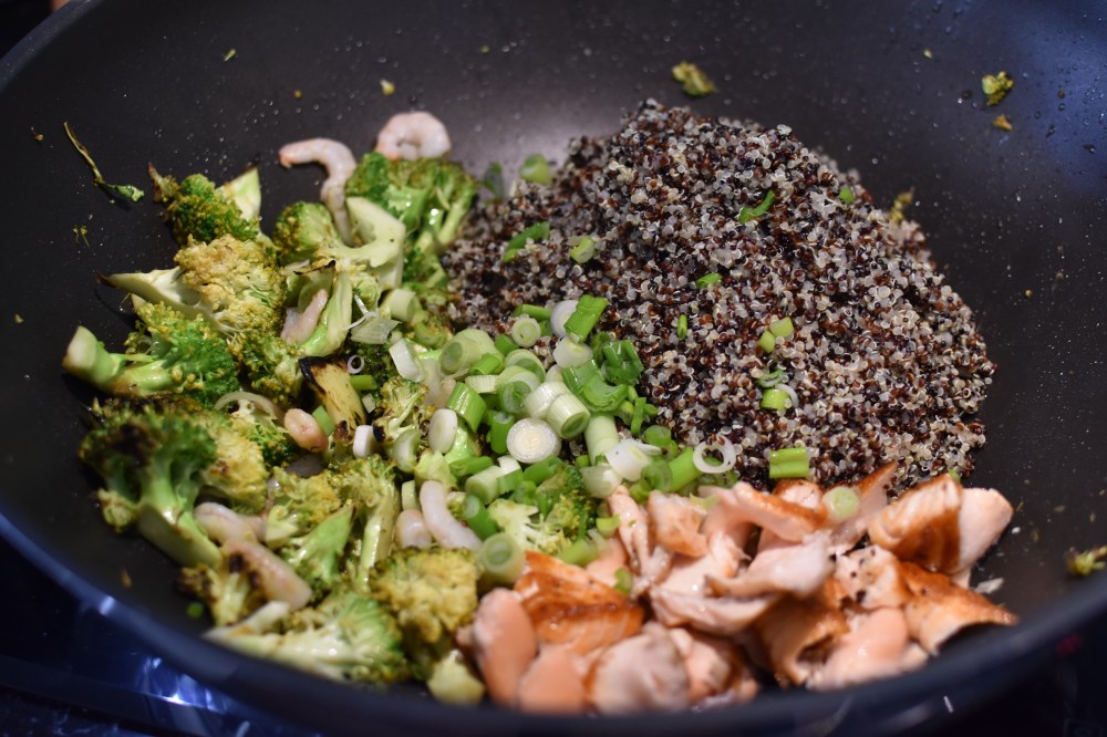 - Add the quinoa to the same pan together with the spring onions and one of the salmon steaks and mix together to combine.
