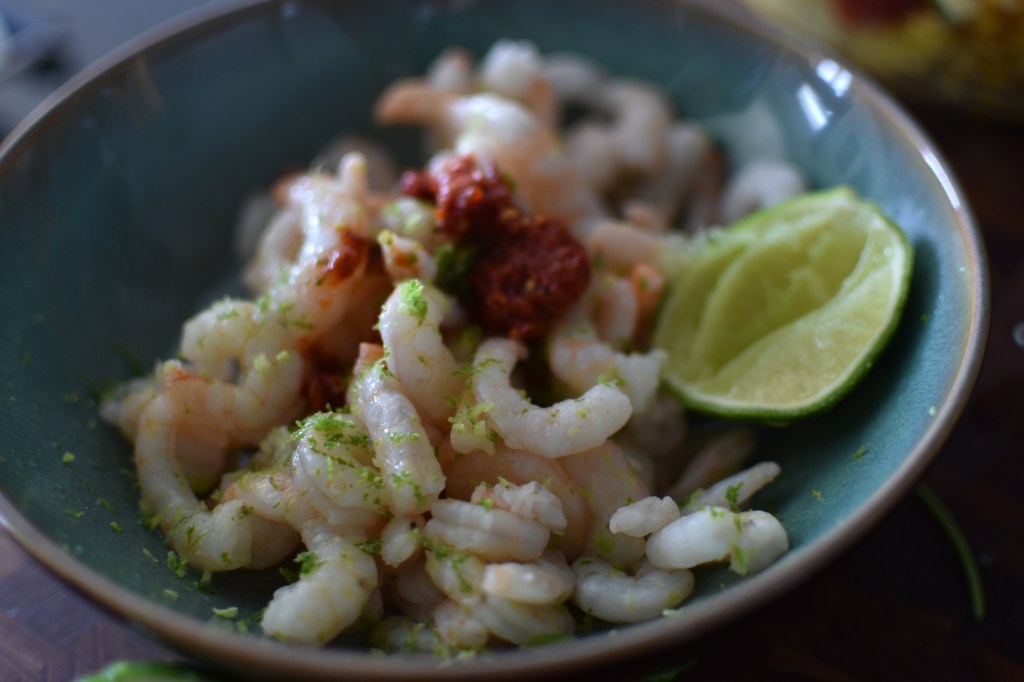- Dress the prawns/shrimps/fish with the zest and juice of 1 lime, some chopped chilli (optional) and salt and pepper.