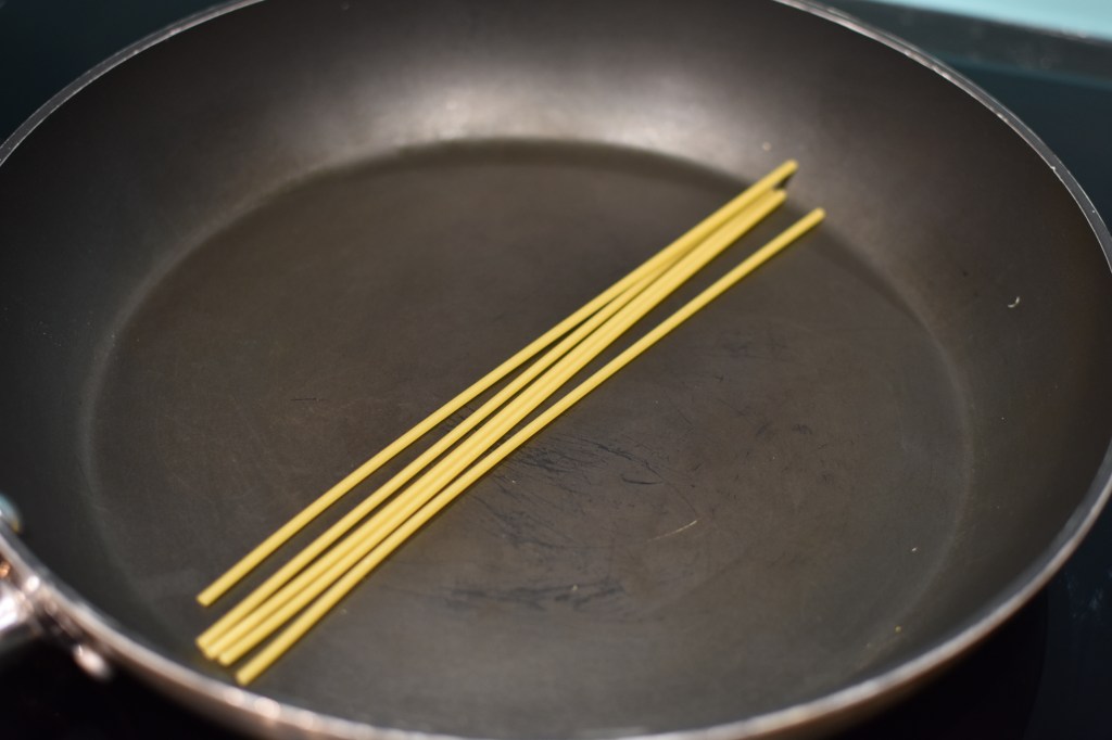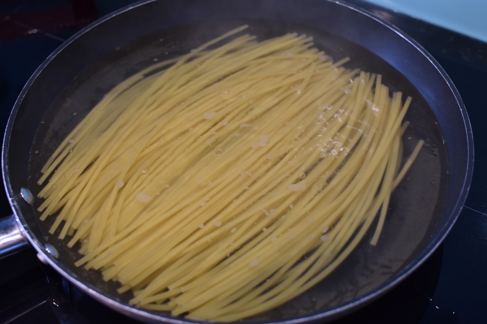- a “wide” large diameter saucepan or frying pan (that your pasta of choice can fit in lying flat – see image below) NB: if you don’t have one big enough, don’t worry! – I’ll explain in the notes section on how to get around this.