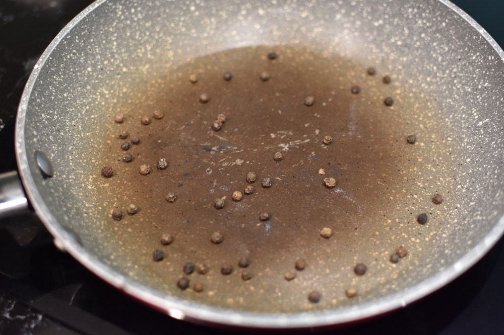 - While you’re waiting for the water to boil, add the pepper corns to the small frying pan over a high heat. Dry roast for about a minute until aromatic, then transfer to a mortar and pestle.