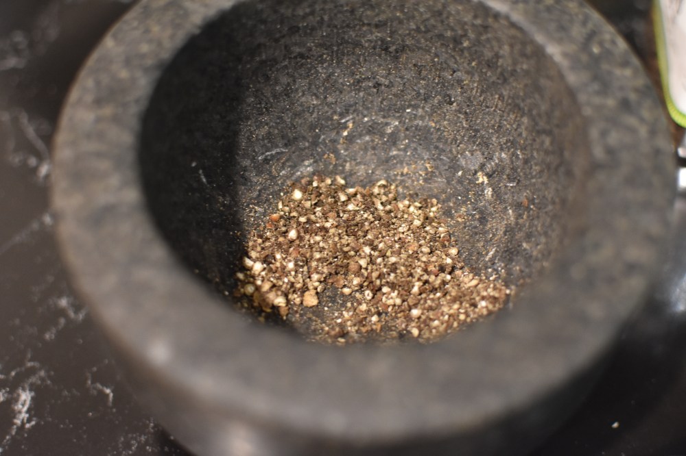 - Roughly crush the peppercorns into a nice mixture of fine pepper with some larger pieces.