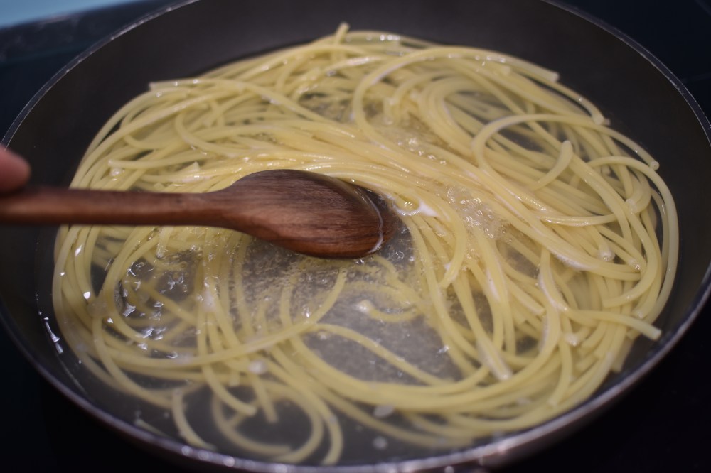 - By now, the water should be boiling. Add the pasta to the pan and cook until it’s “early” al dente – so still got quite a bite, but certainly palatable. Be sure to occasionally mix the pasta around a bit to prevent it from sticking
