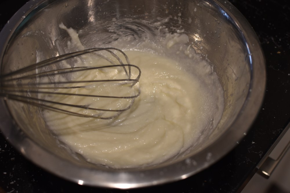 - Over the next minute gradually sprinkle the cheeses into to the water in the bowl whisking continuously to form a white “creamy” sauce. If it gets too thick, add a tablespoon or two of more pasta water to thin it out.