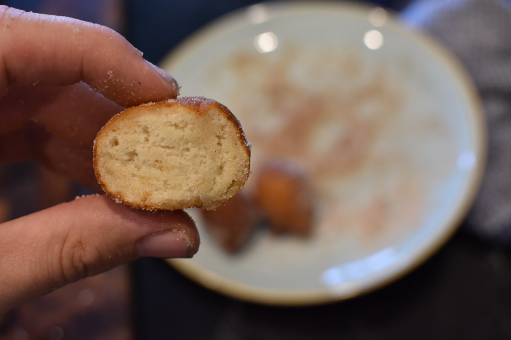 If you don’t have a thermometer (or a deep fryer with a thermostat), you can still make these doughnuts! Warm up your oil over a medium heat. Try adding a small spoon of batter. It should have bubbles fizzing all around it and rise to the surface within a second or two. Also, Make sure that it’s not too hot! If your doughnuts turn dark brown in seconds you’ll end up undercooking the centre.