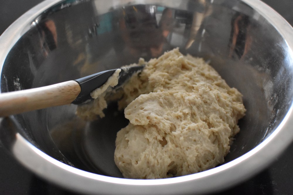 - In a large bowl combine the yogurt and the self-raising flour to form a wet dough.
