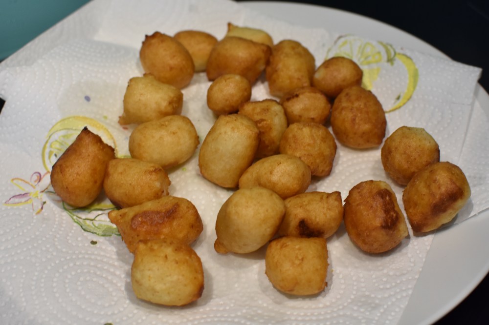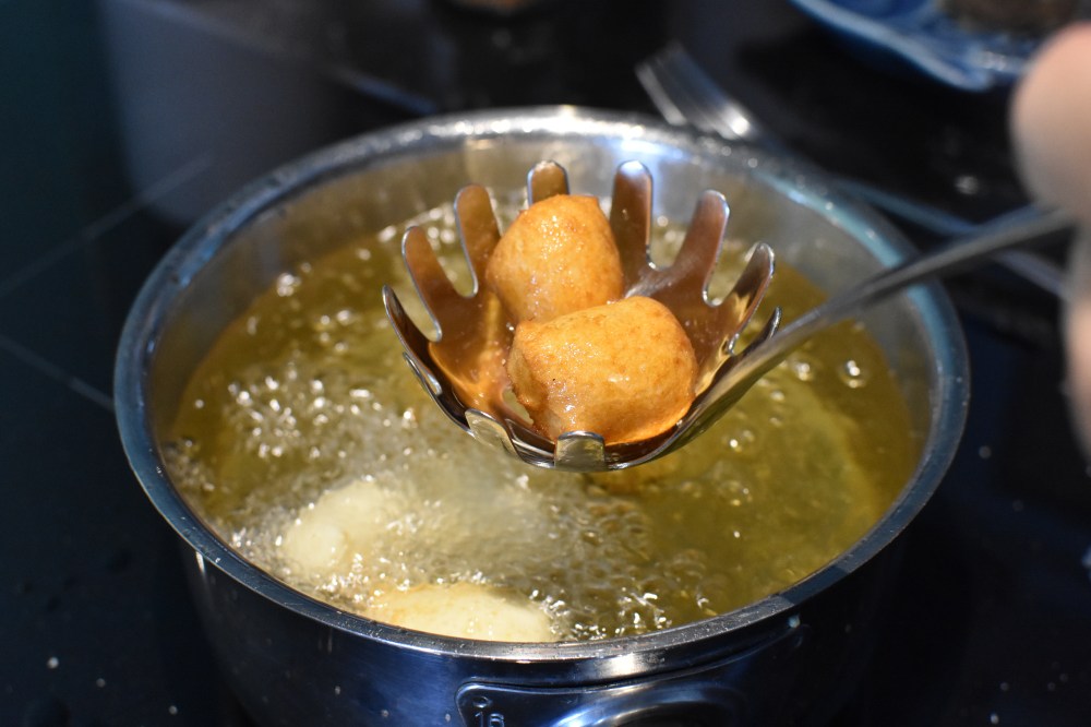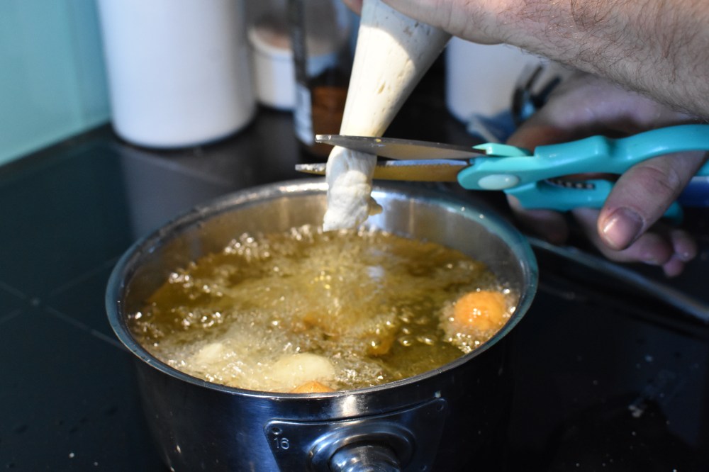 If you don’t have a piping bag – buy one haha! Otherwise, use a decently thick plastic food bag and cut one of it’s corners – congratulations you’ve just made a makeshift piping bag. If you’ve only got really thin cheap plastic bags I suggest using two oiled spoons to “scoop and drop” little balls of dough into the oil.