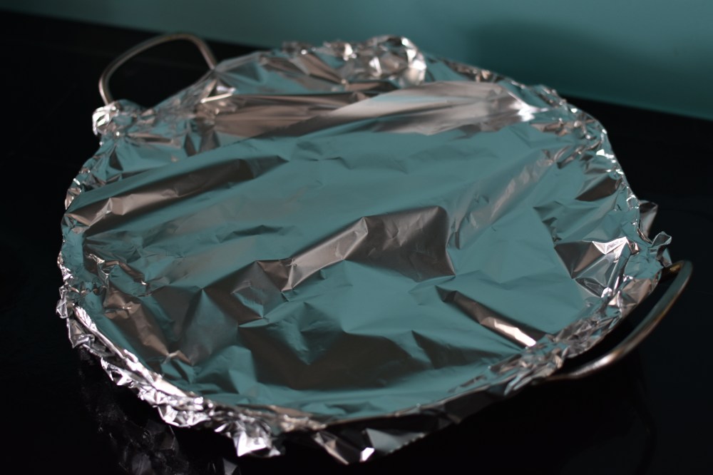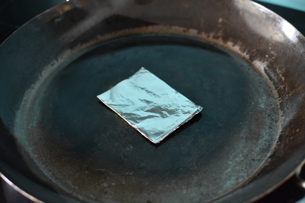 - Place your paella pan over a medium high heat. While it warms up, wrap your saffron into a small envelope shaped piece of foil (to protect the saffron from burning)