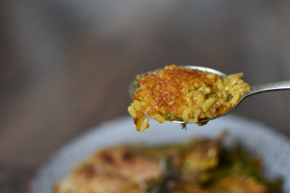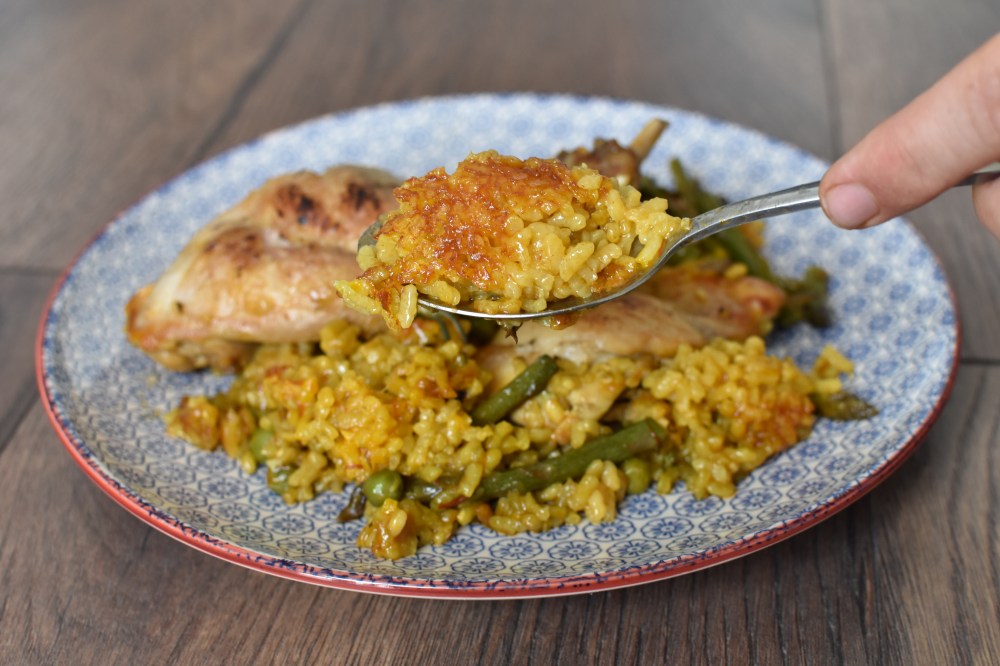 S: You might be cooking it on too high a heat. Or your rice of choice is super good at absorbing water. Don’t panic. As a rough guide, after the first 5 minutes of the cooking the paella on low heat (part of step 12 in the method) the water level should be just below the level of the rice. If the pan is already completely dry, then add a little bit of boiling water from your kettle to top it up. Don’t go overboard. Oh and make sure the paella is over a low heat at this step. If it’s the opposite and you’ve got too much water just turn up the heat a little bit for 1-2 minutes to help it evaporate off quicker. Or spoon off a few tablespoons from the surface.