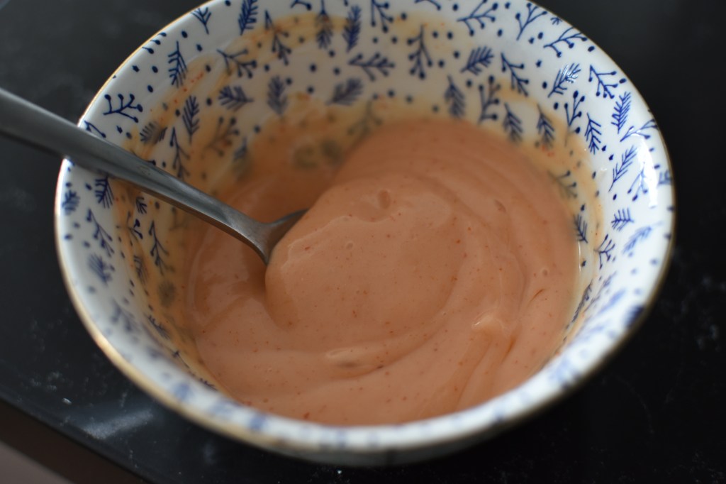 - Prepare your sauce by combining the sesame seed oil, mayo, sriracha, mirren and rice wine vinegar in a small bowl.