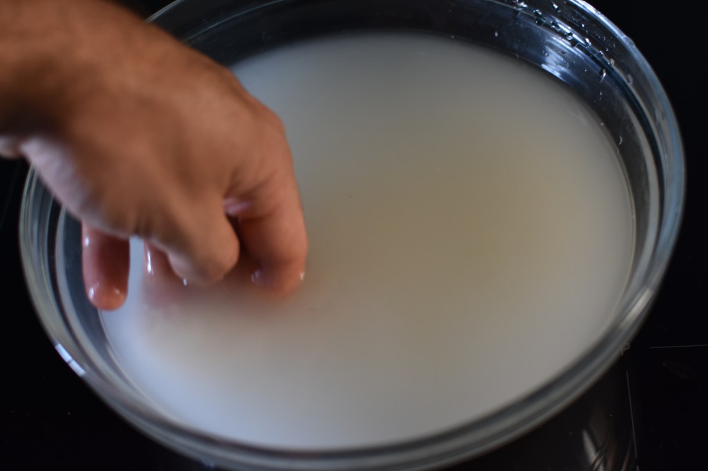 - Wash your rice in a large bowl with cold water, stirring in a circle with your hand. Drain the water and repeat until the water becomes clear. Allow to soak for at least 15-30 minutes.