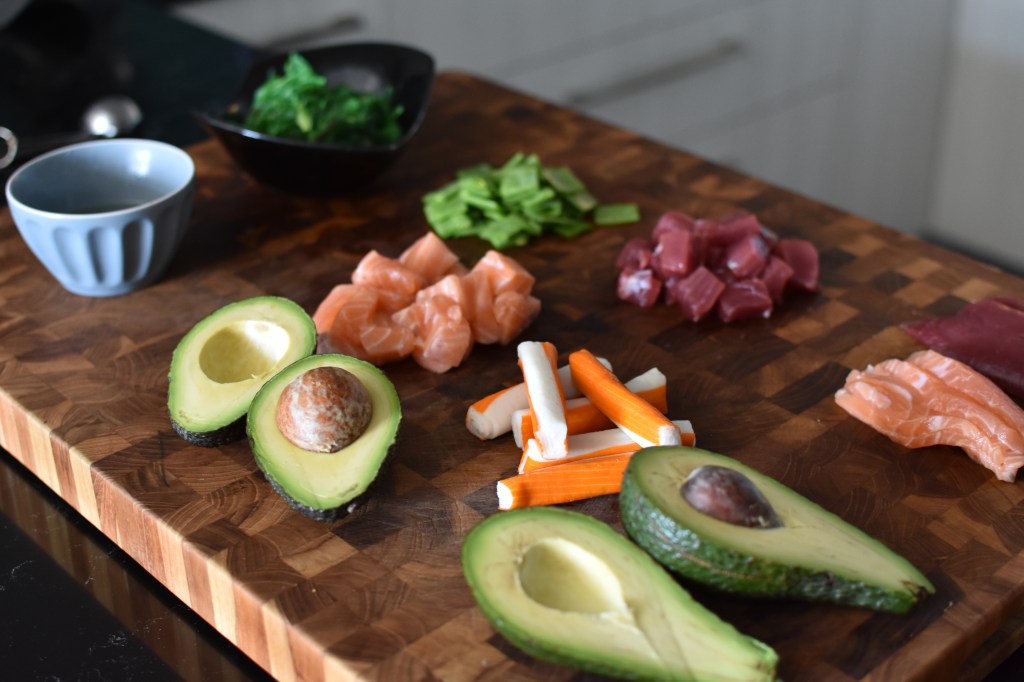 - Chop up or slice all of your fish/vegetables. If you intend to cook some of your toppings (such as teriyaki seared salmon or tempura prawn), now is the time. NB: if using avocado, make sure you squeeze over some lemon juice to prevent it from turning black!