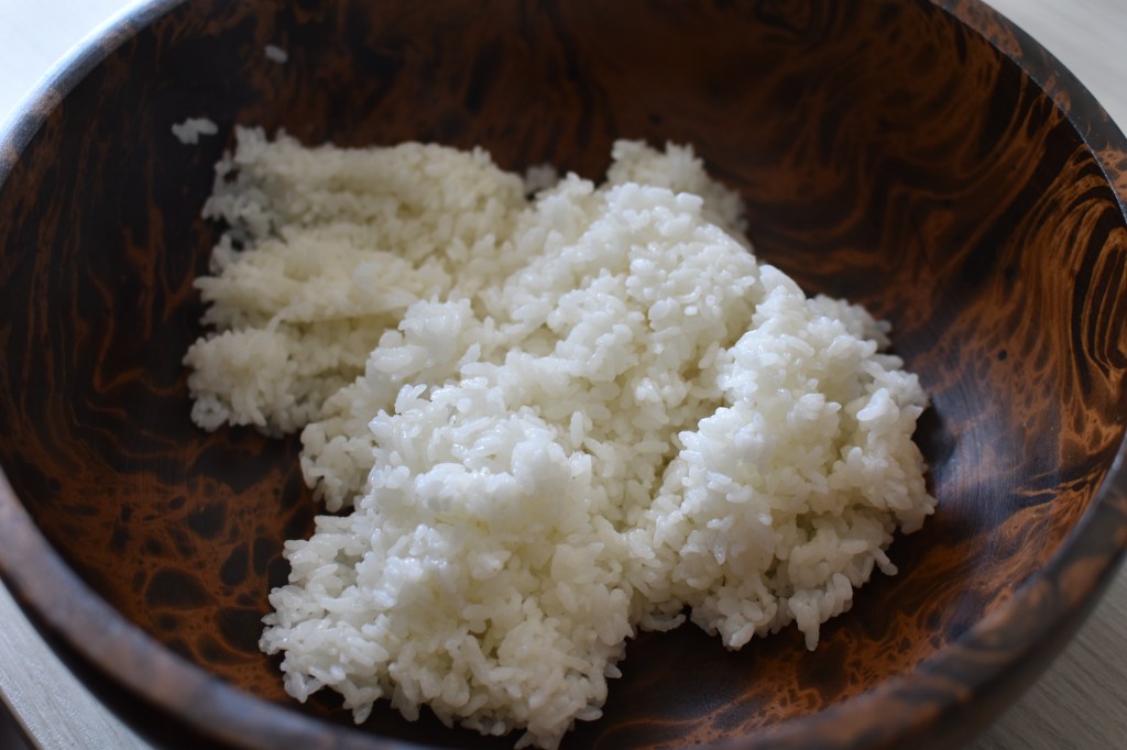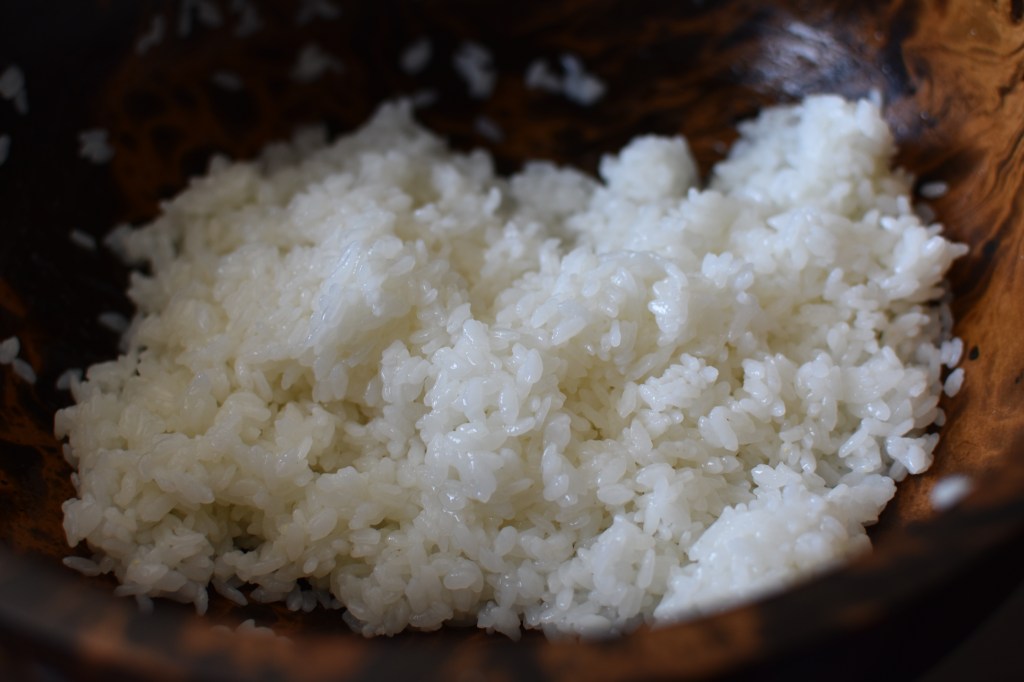 - When the rice is ready, wet the surface of a large (ideally wooden) bowl with a splash of water.