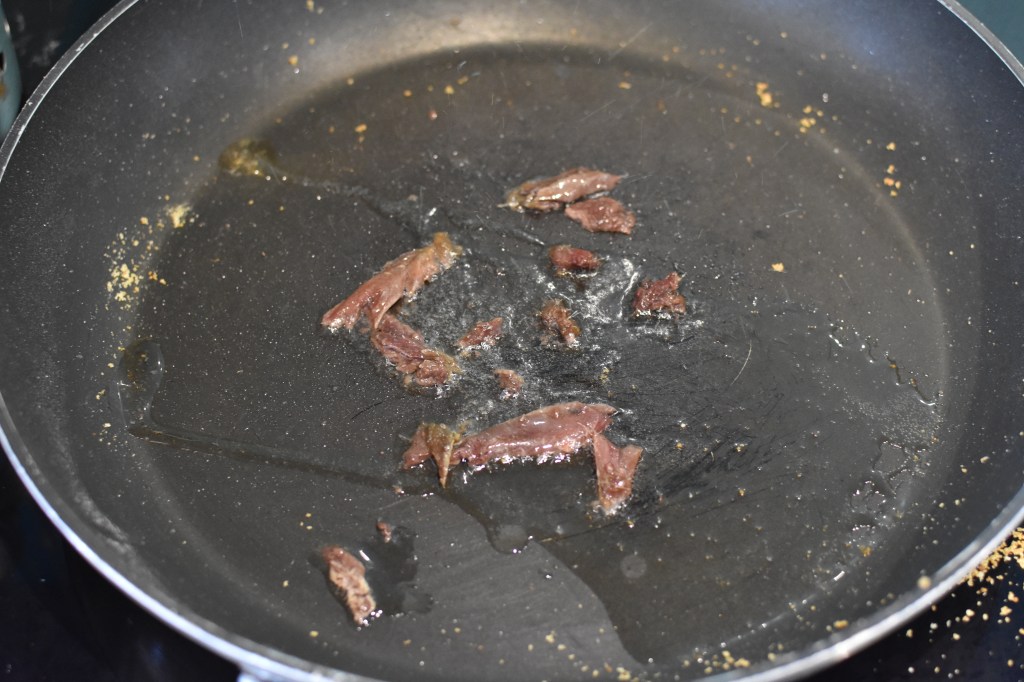 - While your pasta is cooking add the anchovies and their oil to the frying pan and fry off for a minute over a medium high heat. If your adding chilli, now is the time.