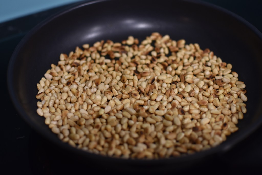 - Toast the pine nuts for a few minutes in the same pan until golden. Remove and reserve for later.