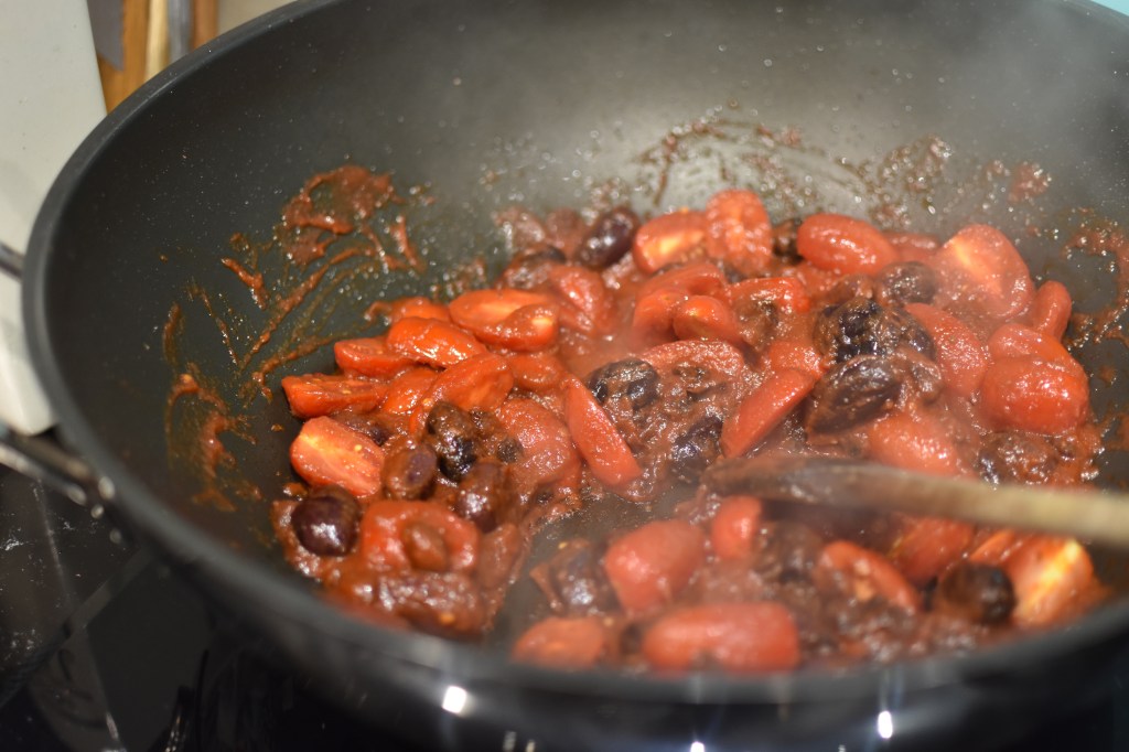 - Then, add the sun-dried tomatoes (if using), olives and raisins and cook for another 2-3 minutes. Remove from the heat and set aside.